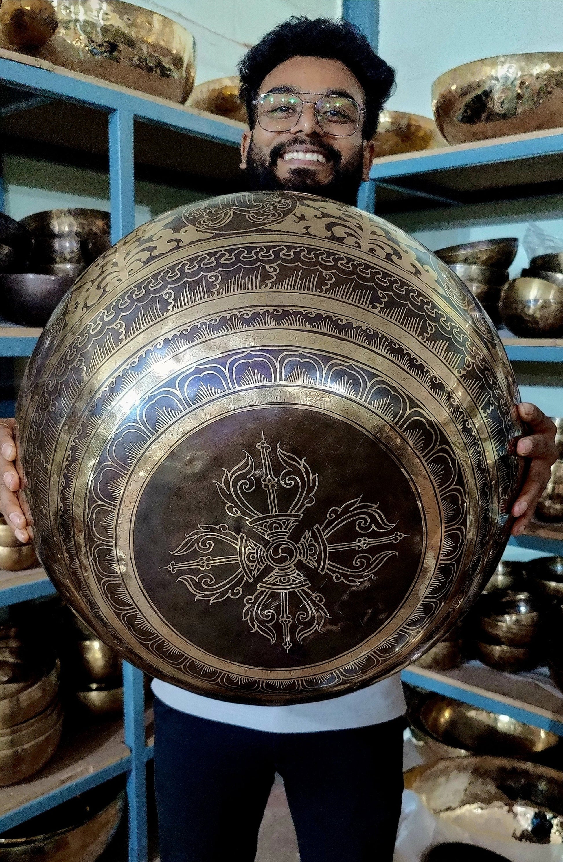 Our Authentic Large Tibetan singing bowl is mainly used for Meditation, Sound bath, sound therapy, chakra healing, vibration therapy and mindfulness practices. This singing bowl is made of seven different metal like gold, silver, copper, iron, tin, lead, and zinc. Each of these metals represent a unique purpose, symbolizing the Sun, Moon and other different planets that attract the positive energy for mental as well as physical peace. We make our singing bowl by hand hammering process and etching/carving process are done by talented Nepali artisans.