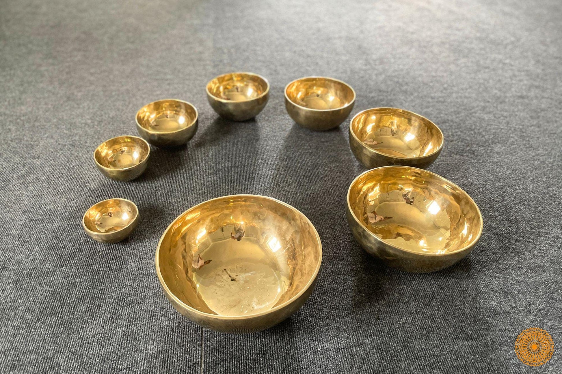 This singing bowls were hand-crafted in Nepal. This singing set includes seven singing bowls and Seven strikers (mallets). One Gong Strikers and Seven silk cushions.