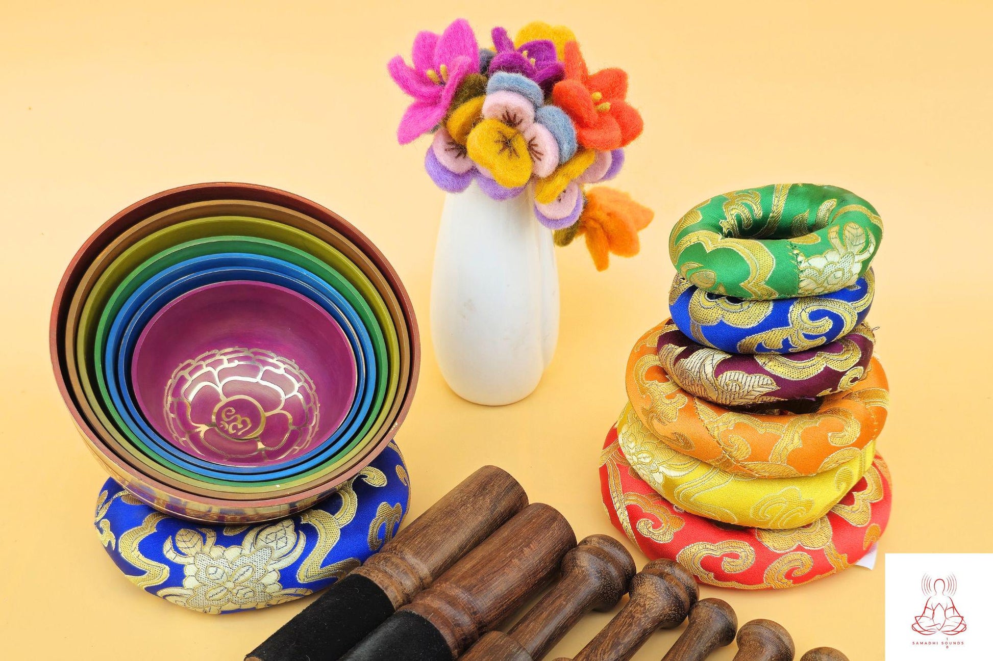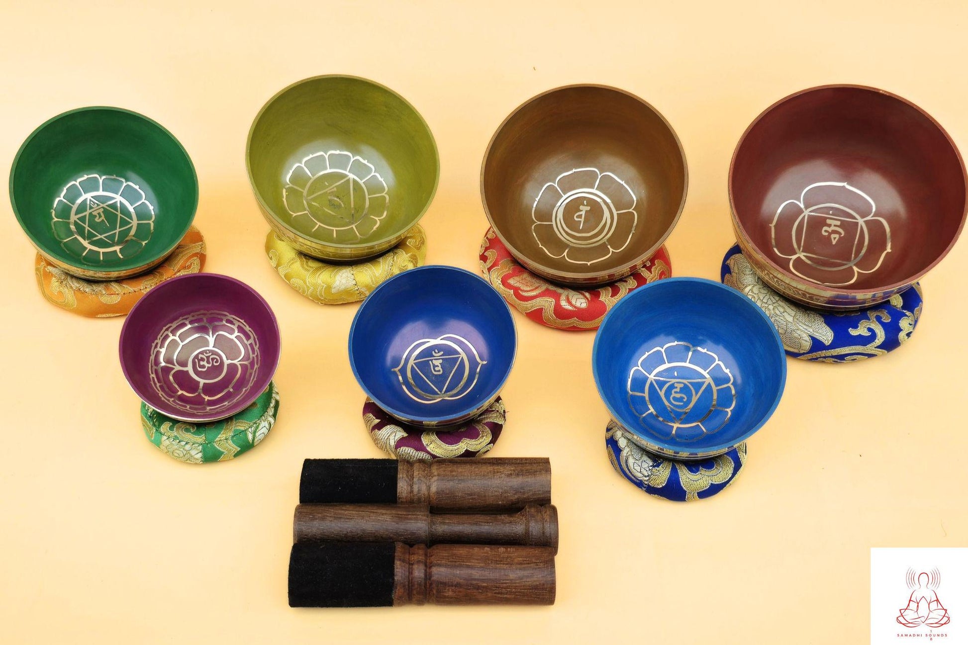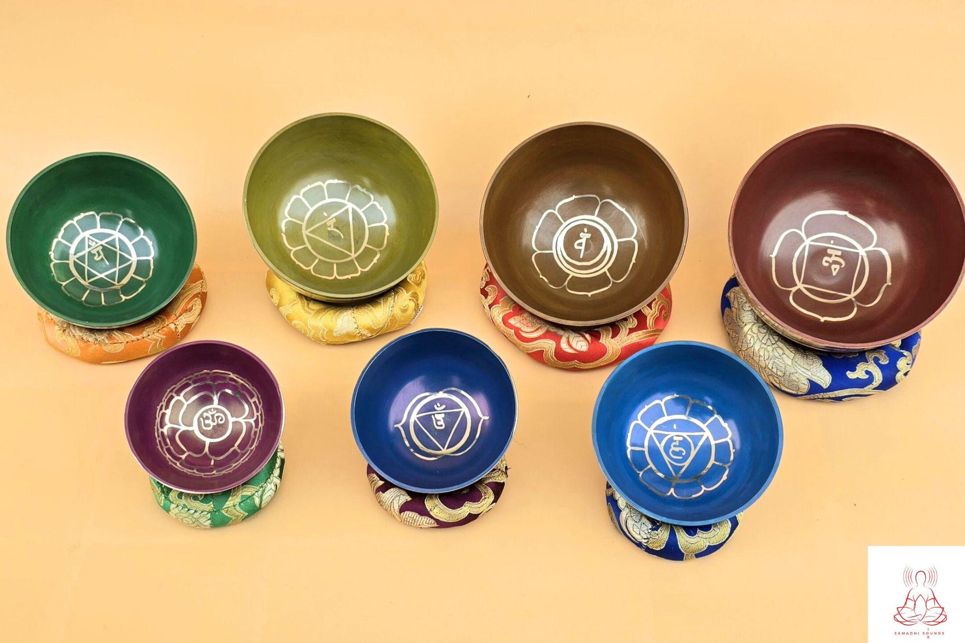 This set of 7 Chakra painted singing bowl is handmade in Nepal. This set of 7 Chakra singing bowl is decorated with Mantra and symbol of Chakra that represents balance or harmony in life. It's also a tool to purify, relax and meditate your mind, heal and balance your chakras. Each bowl is about 2.54 inches to 5.5 inches in diameter and comes with box, seven mallets and seven cushion as shown in this picture that you can use to balance your body and mind. Perfect for meditation, these singing bowls also make lovely gifts for loved ones or yourself! We offer free shipping worldwide