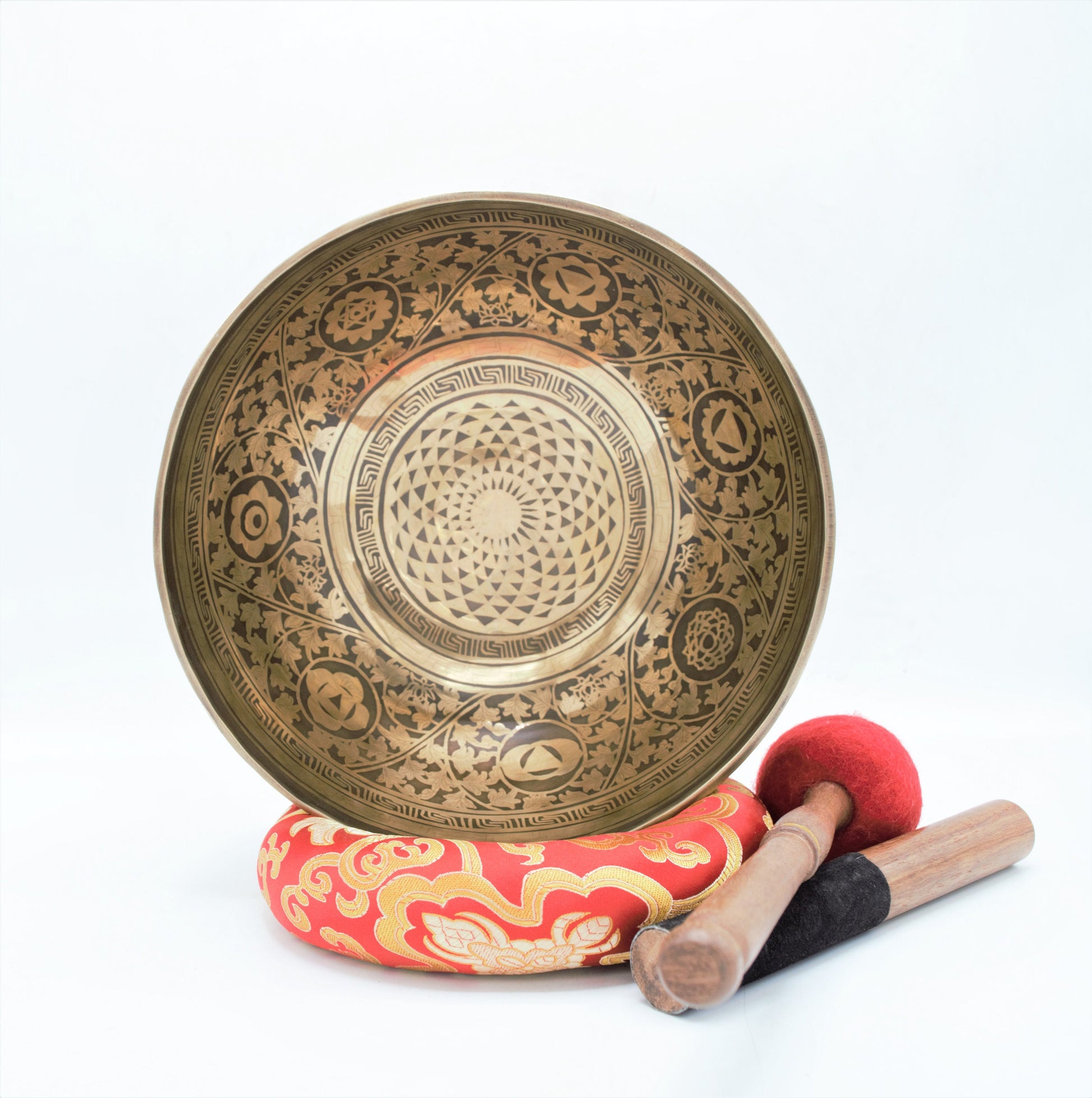 Flower of Life Carved Singing Bowl: 10 inch Tibetan Bowl for Sound Healing