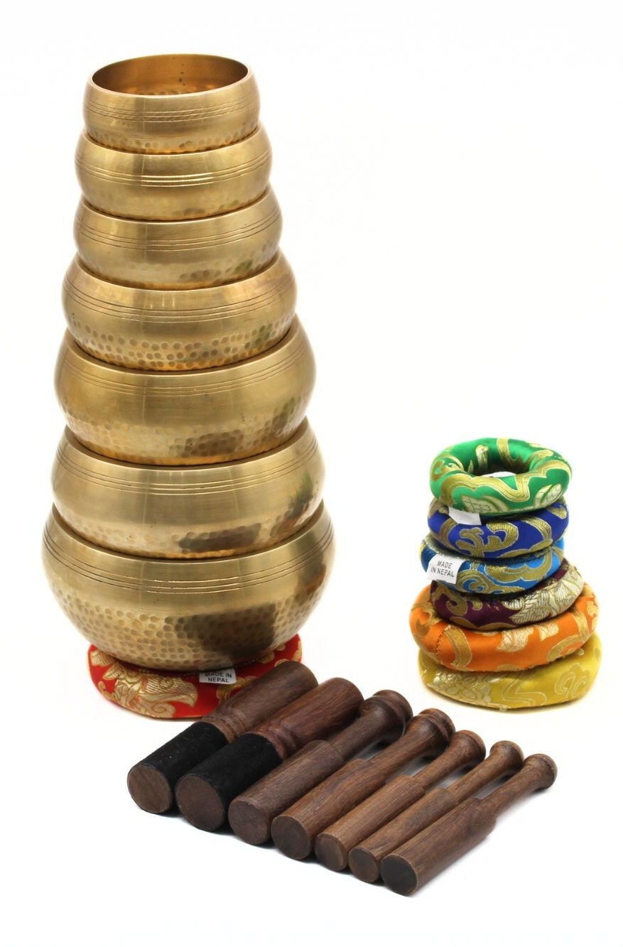 "Set of Seven Hand Beaten Tibetan Singing Bowls from Nepal, Chakra Set for Meditation and Chakra Cleansing"