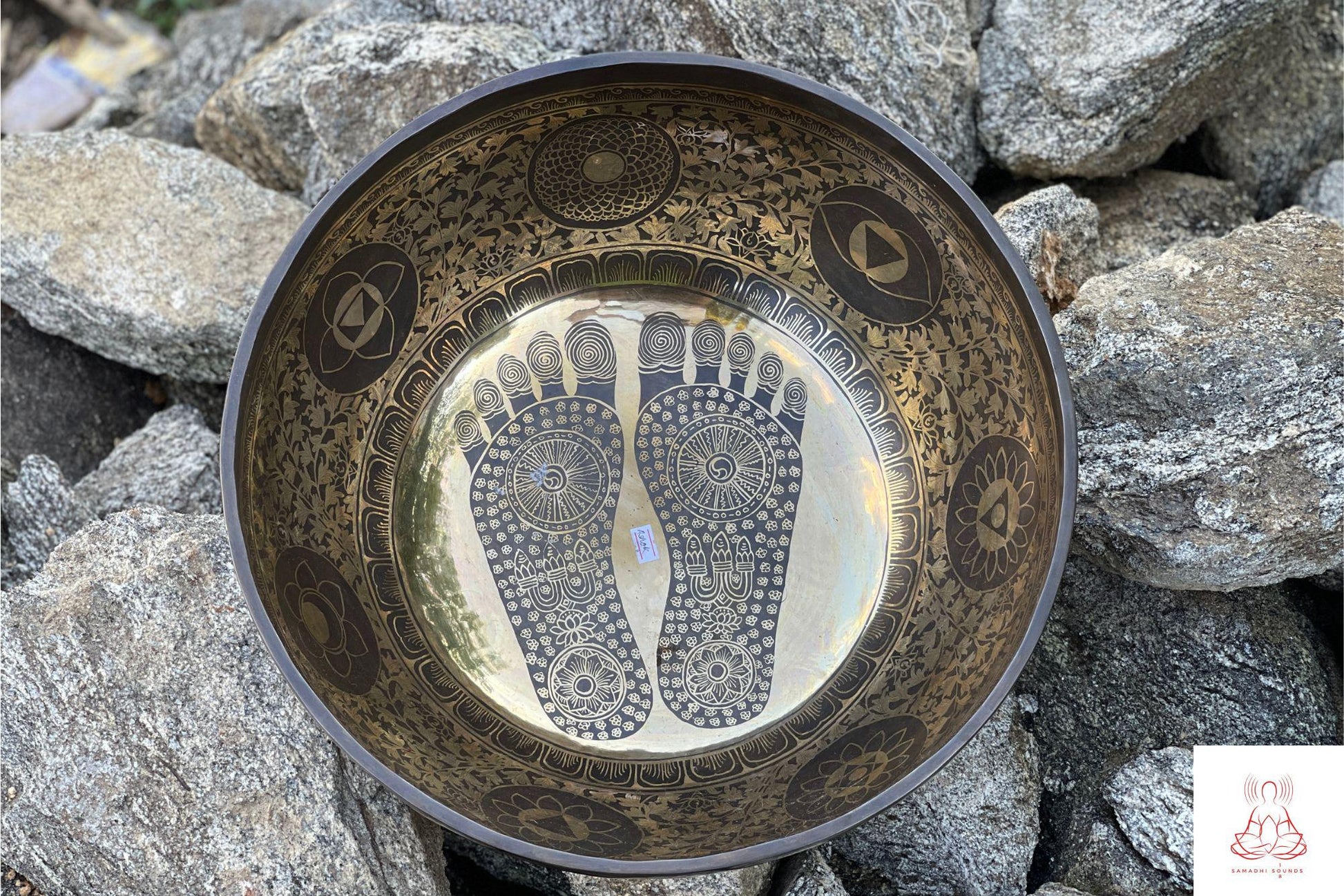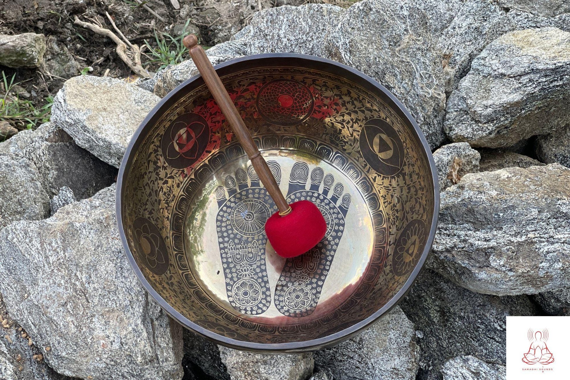 Hand Engraved Buddha Footprint Singing Bowl: Sound Healing Therapy