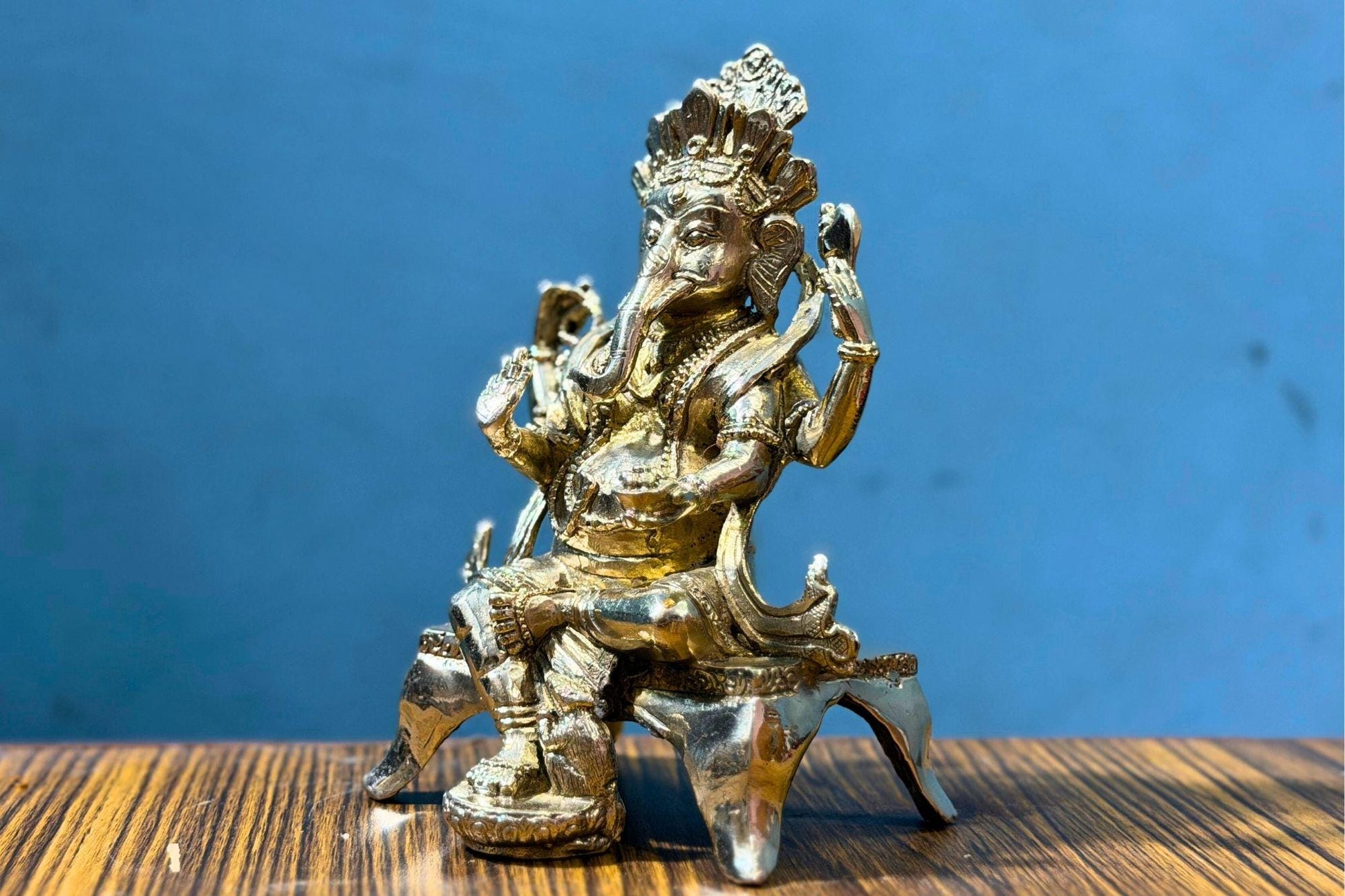 Bring divine grace, positivity, and timeless artistry into your space with this handmade brass Lord Ganesh statue in a radiant golden finish. Expertly hand-crafted by skilled artisans, this beautiful statue depicts Lord Ganesh seated on a bench, symbolizing wisdom, prosperity, protection, and the removal of obstacles.
