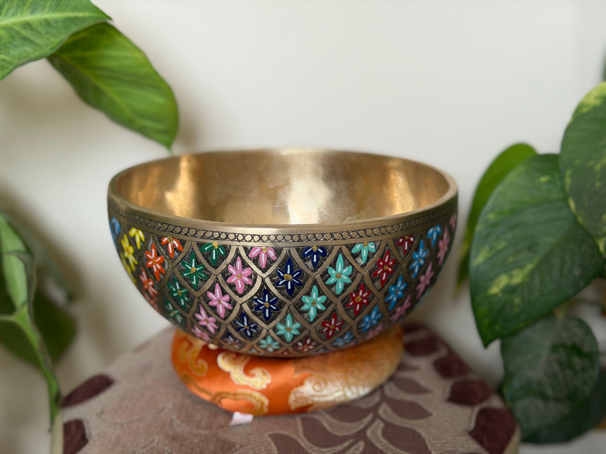 The vibrant hand-painted floral patterns and intricate detailing make each bowl a unique piece of art, radiating both visual beauty and spiritual energy. Ideal for sound healing, yoga, meditation, or as a stunning home décor piece.