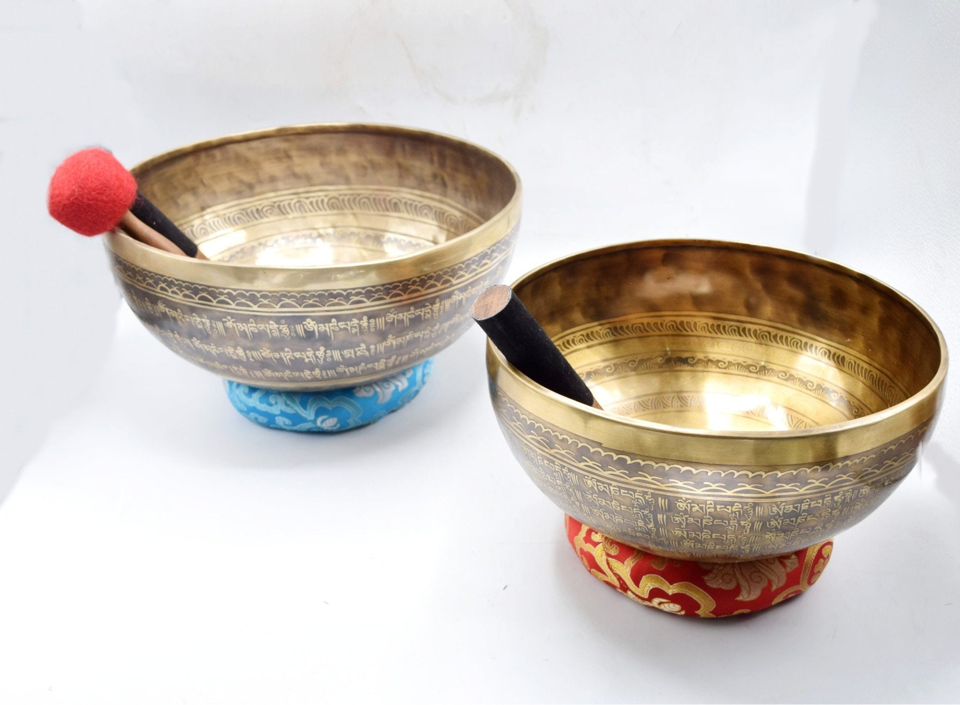 Mantra Engraved Singing Bowl Set: Handmade Tibetan Meditation Bowl